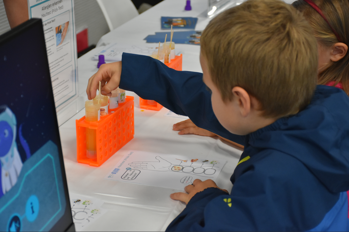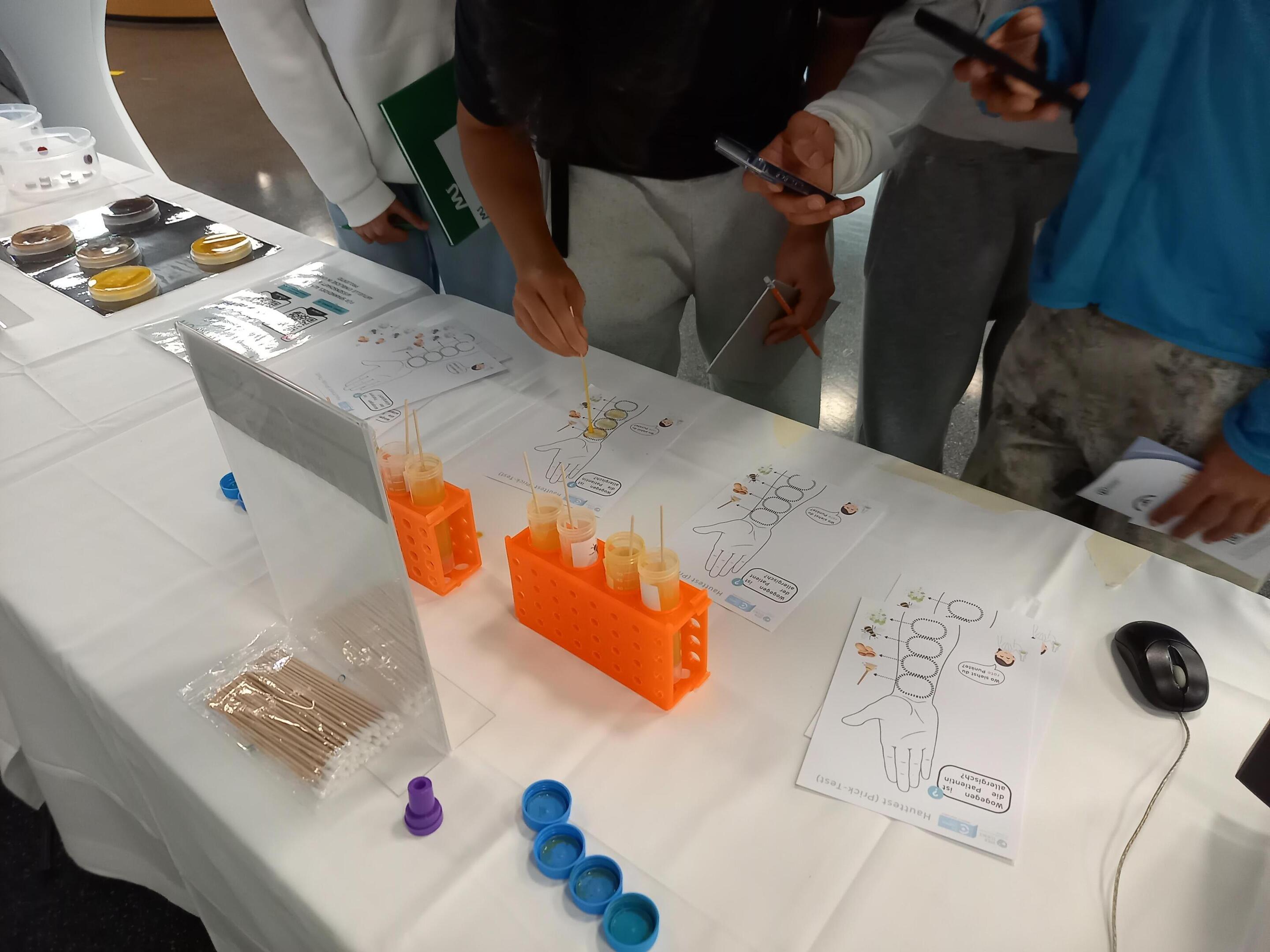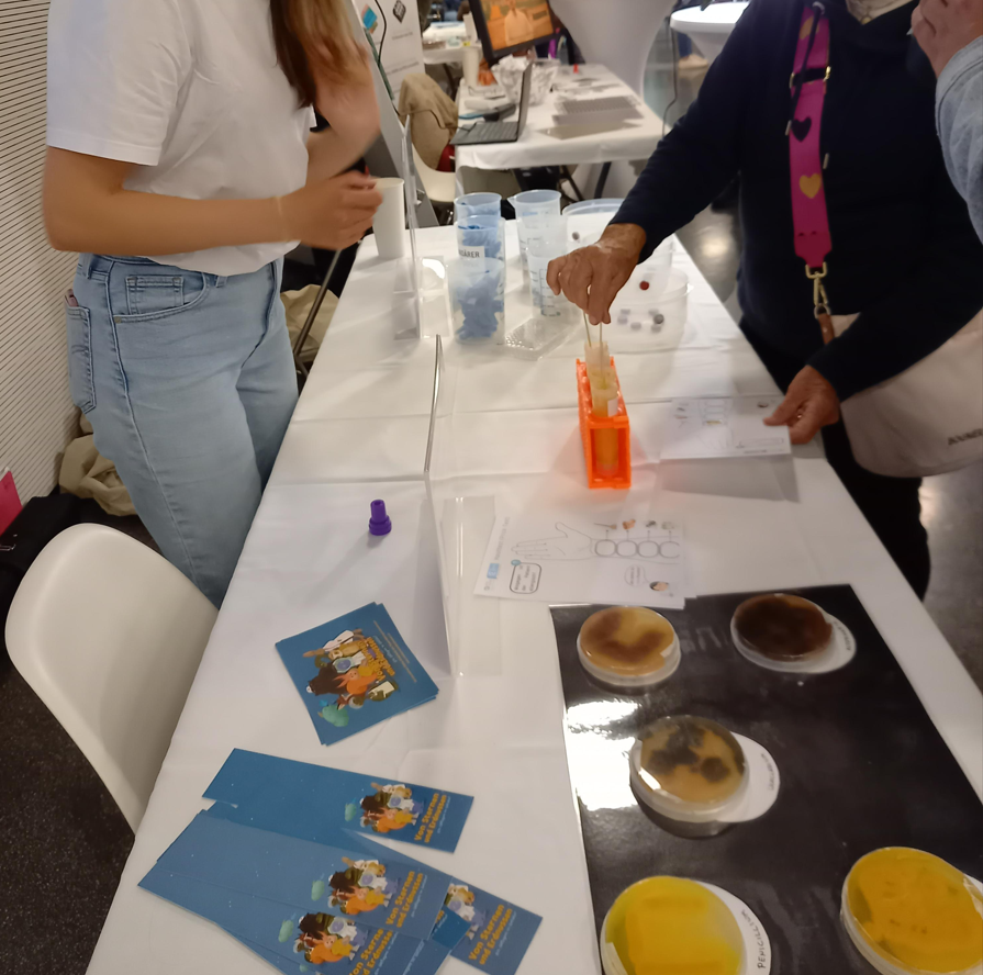 Mit unserem Kinderbuch „Von Sternen und Erdnüssen – Ein Oktopus in Gefahr“ konnten schon die Jüngsten in die Welt der Allergien eintauchen. Bei unserer Station konnten die Besucher:innen auch Methoden kennen lernen, wie Allergien festgestellt werden und testeten unsere fiktiven Patient:innen auf Allergien. Außerdem gab es die Möglichkeit, verschiedene Schimmelpilze, die Allergien auslösen können, genauer unter die Lupe zu nehmen.
